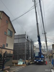 最近道路付けの難しい案件が多く手起こし(重機を使わずに棟上げする)の現場を立て続けにこなしていたので久しぶりにクレーンを使った建方となりました。