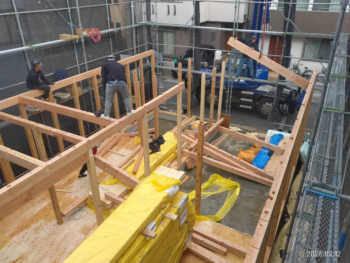 最近道路付けの難しい案件が多く手起こし(重機を使わずに棟上げする)の現場を立て続けにこなしていたので久しぶりにクレーンを使った建方となりました。